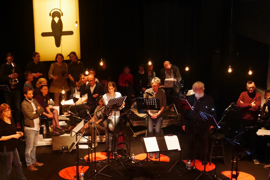 Écriture : Achille Grimaud & Anne Marcel / Création Sonore : Mikael Gaudé / Création musicale : David Georgelin / Direction : Ariane Burési / Distribution : Achille Grimaud, Fanny Bouffort, Benoît Hattet, Gérard Boucaron, Sylvain Le Houëdec / Régie : Samuel Collet avec la participation des élèves de Trio…s, de la chorale Ktema, des élèves de la classe de 5ème du collège Paul Langevin, des résidents de l’ehpad La Sapinière.