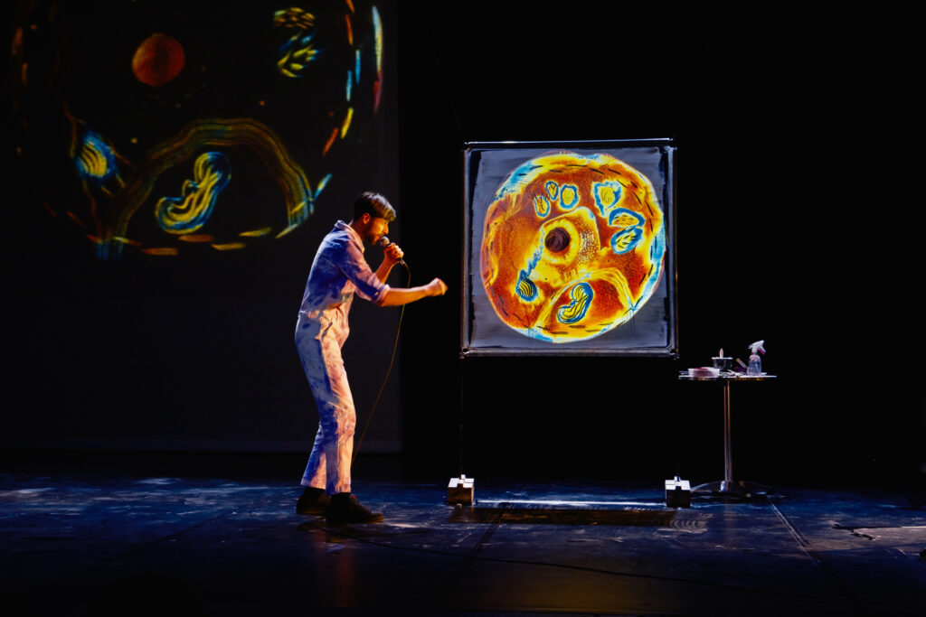 Ce spectacle sublime la vision de nos organes, nos cellules, nos humeurs sous toutes leurs formes en mêlant peinture, mapping vidéo et musique pour en faire une cartographie colorée et musicale. Ce voyage est une réponse poétique aux questions que posent les liens entre nos corps et les structures du vivant qui nous entourent.