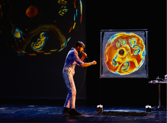 Ce spectacle sublime la vision de nos organes, nos cellules, nos humeurs sous toutes leurs formes en mêlant peinture, mapping vidéo et musique pour en faire une cartographie colorée et musicale. Ce voyage est une réponse poétique aux questions que posent les liens entre nos corps et les structures du vivant qui nous entourent.