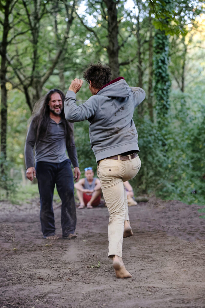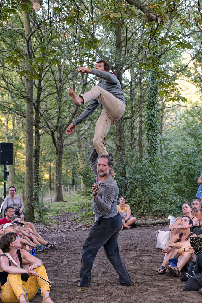 Ils sont acrobates, quarantenaires, ils ont poussé loin les prouesses techniques et ce n’est plus leur quête, pourtant le vertige reste leur grande passion et l’engagement physique est total. Leurs recherches se concentrent désormais sur des aspects plus subtils de leur pratique et les découvertes autour des notions du poids, de la relation et du déséquilibre ouvrent des champs tout aussi excitants à appréhender. Comme ils aiment à le rappeler : Quel sens a notre chemin d’acrobate de main à main, si ce n’est celui du toucher, de toucher et d’être touché.