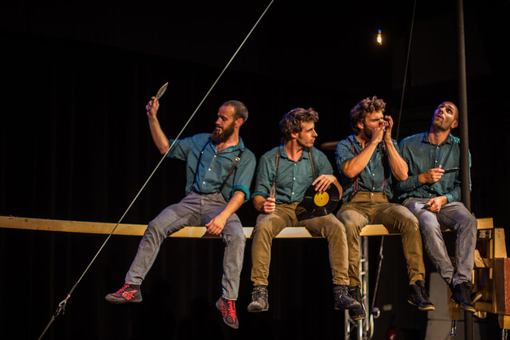 Ces quatre artistes Franco-Suisse épatent par leur créativité, leur humour noir et leur dynamisme. Leur cirque est très concret, avec de la bascule, du mât chinois, de l’échelle libre, du lancer de couteaux … Il est aussi plein de chanson détournées et de drôleries. L’ensemble est furieusement enthousiasmant.
