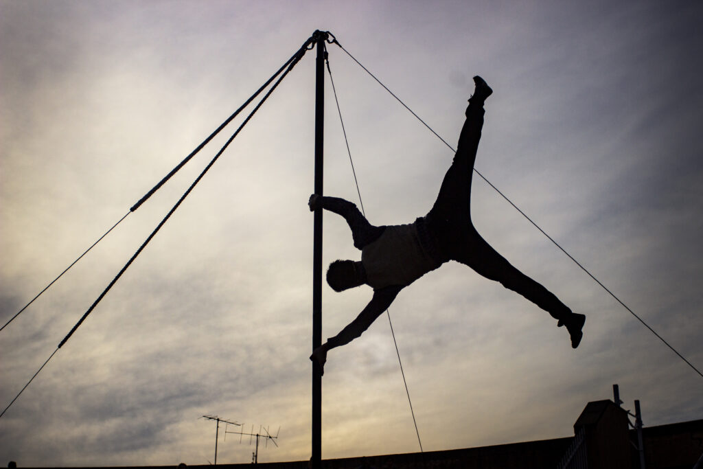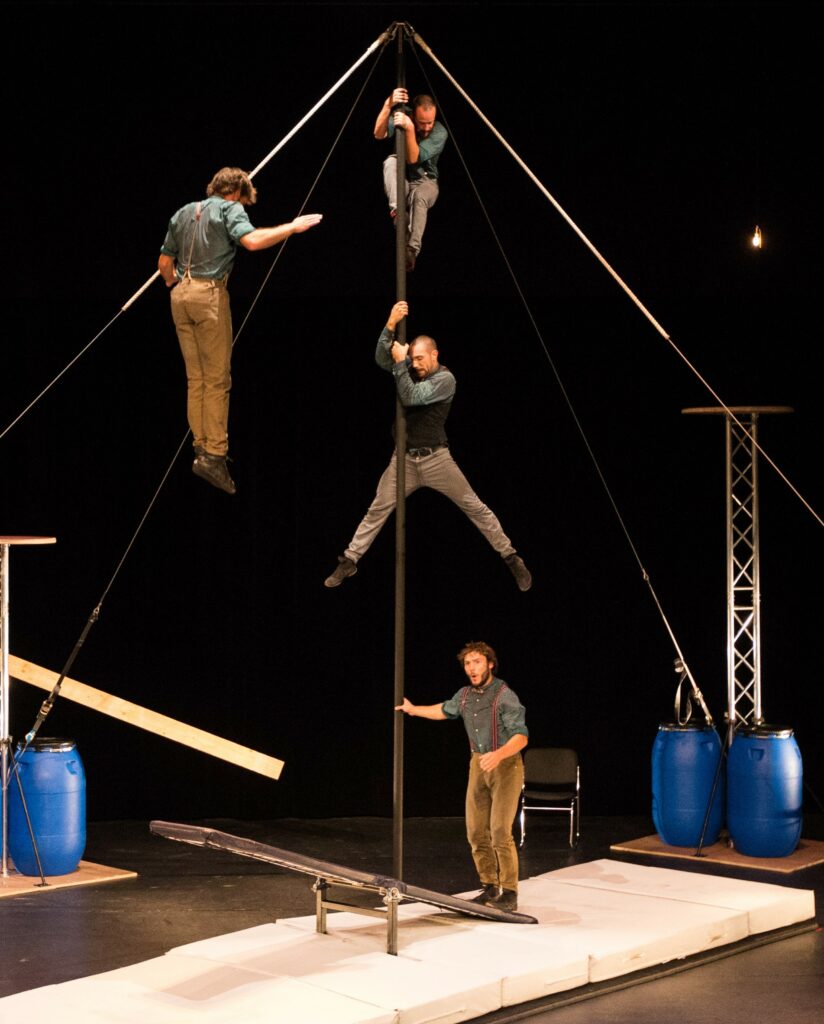 Munis d’une planche coréenne, d’un mât chinois, de bidons et d’une échelle libre ces quatre acrobates s’élancent sans hésitation dans les airs et nous font passer du rire aux frissons, au rythme de leurs mélodies. Ça tombe et ça carbure à l’adrénaline pure, ça saute et ça bouge dans tous les sens. Ici, l’amitié et la fraternité s’exposent comme un espace de solidarité.