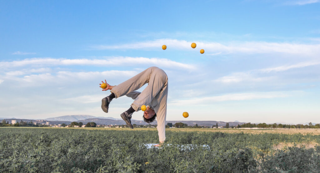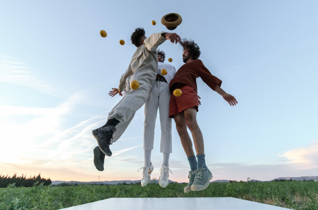 Mellow Yellow nous plonge dans un univers du quotidien : quelques chaises, une radio, une plante… Avec une petite dose d’absurde et un trait de malice, les voilà tous les trois qui réussissent le fol accord entre danse, jonglage et acrobatie.