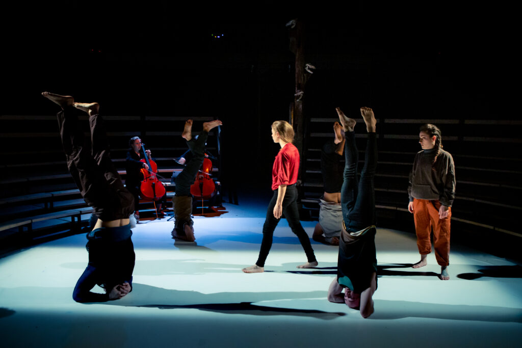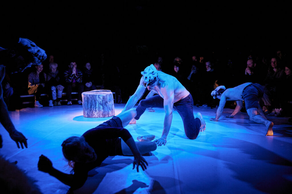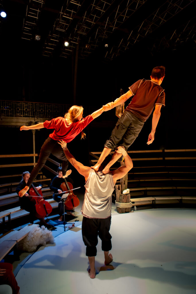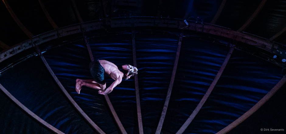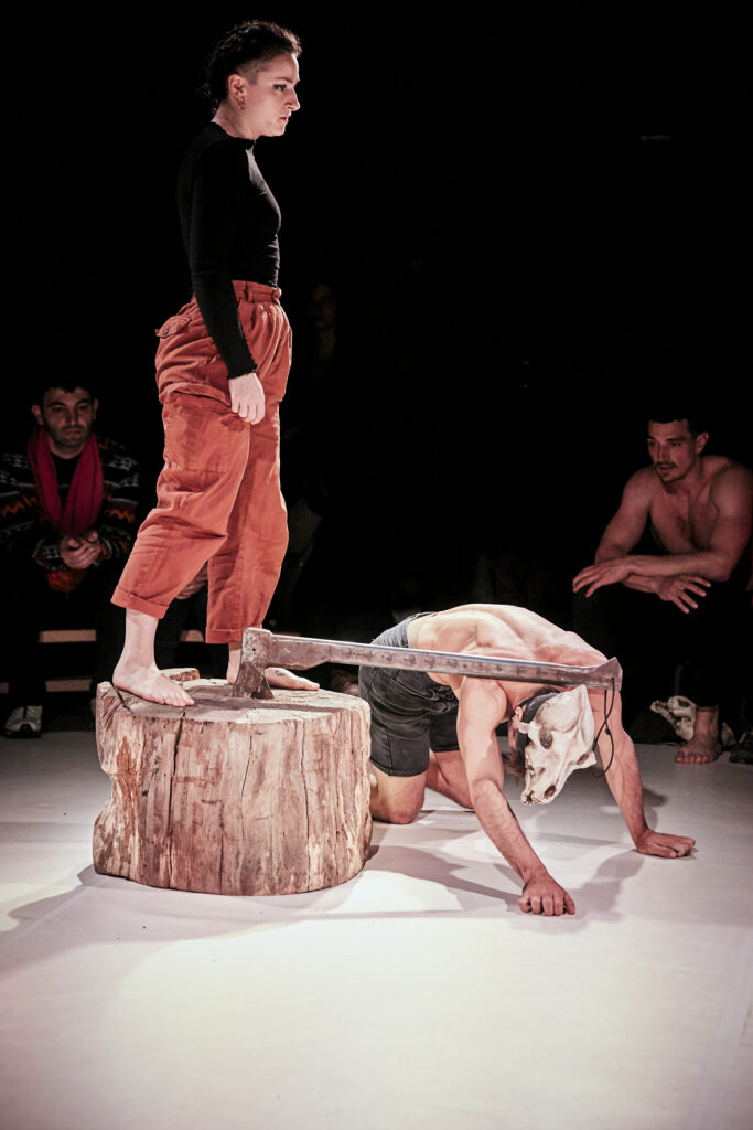 Rassemblé en cercle autour d’un espace de jeu réduit, le public voit se déployer un imaginaire où s’affrontent des forces enfouies. Un cirque-cérémonial à couper le souffle, où se succèdent, au pied d’un totem, deuil, danse tribale et corps sauvages, jusqu’à ce que s’élève le chant, qui oppose peu à peu l’harmonie au chaos.