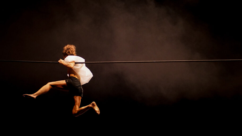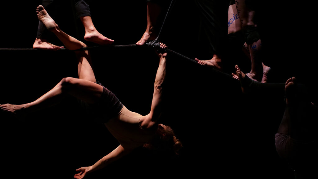 Pièce de cirque et de poésie, Traverser les murs opaques engage cinq interprètes dans la recherche du soulèvement et d’une résistance face au sentiment d’impuissance. En équilibre dans les airs, le corps y est un langage pour éprouver le collectif et se relier au monde.