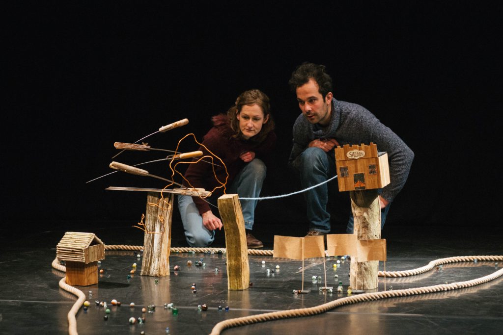 Une corde au sol pour tracer les territoires, une scie et ses dents pour imager les montagnes rocheuses acérées, un peu de farine pour la neige, des zooms, des travellings, des plans larges… Le théâtre d’objet sert une mise en scène hautement cinématographique. Véritable anti-western américain, Celle qui marche loin nous montre avec humour ceux et surtout celles que l’Histoire met de côté.