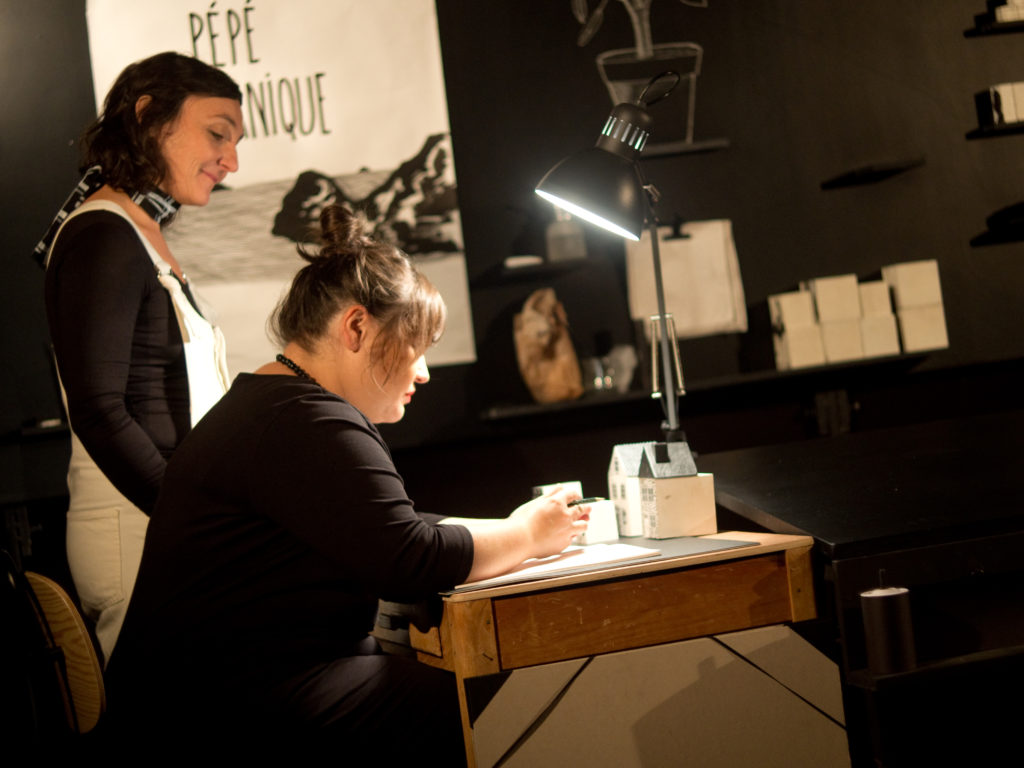 Ces instants partagés prennent vie sur scène à travers les mots de la comédienne Marina Le Guennec et les dessins de l’illustratrice Agathe Halais. Ensemble, elles animent une foule de petits objets, empilent des cubes, les assemblent et les couvrent de dessins… L’illustratrice opère à vue, teste, déplace, esquisse, dessine une grande fresque pendant que la comédienne nous raconte cette jolie relation entre une petite fille qui grandit et un pépé qui vieillit.