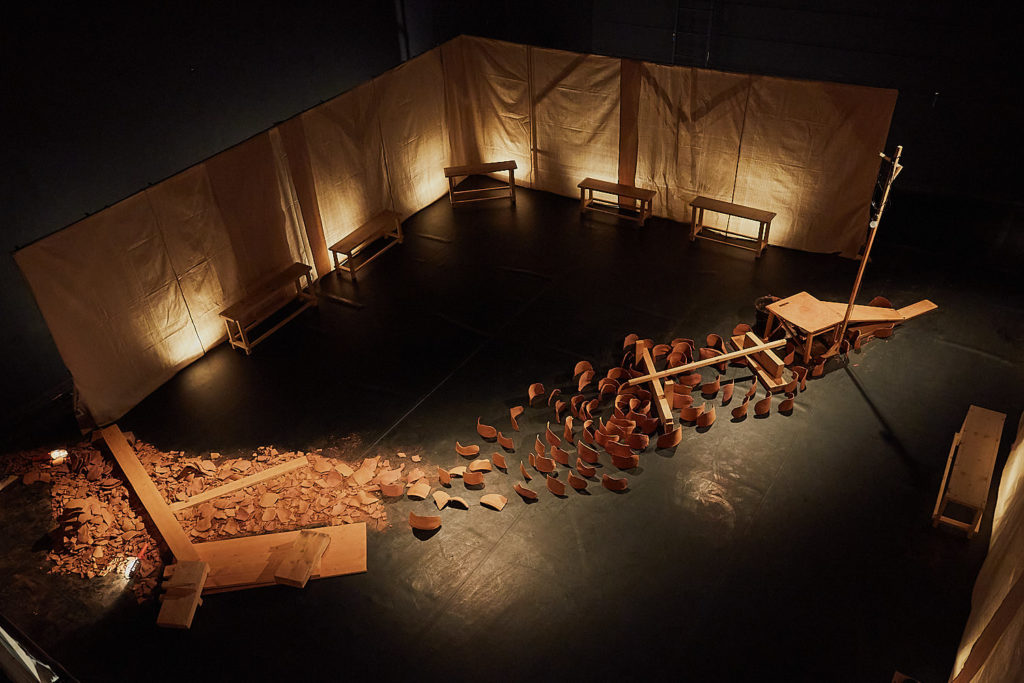 Au cœur d’un dispositif archéologique, une femme déjà à l’œuvre, invite progressivement le public à se saisir de morceaux d’argile, rouge, comme la terre de nos ancêtres. À travers les métamorphoses de la matière en direct, des fragments d’humanité se dévoilent.
