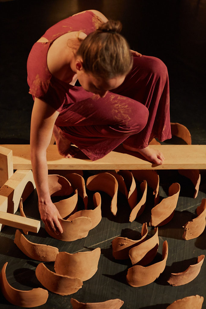 CONCEPTION ET MISE EN SCÈNE CARINE GUALDARONI COMPOSITION, GLANAGES SONORES ET INTERPRÉTATION MUSICALE JÉRÉMIE BERNARD CHORÉGRAPHIE ET INTERPRÉTATION EN ALTERNANCE ALICE MASSON, CARINE GUALDARONI RÉGIE GÉNÉRALE (PLATEAU, LUMIÈRE ET SON) EN ALTERNANCE BAPTISTE DOUAUD, ANNABEL HANNIER CRÉATION LUMIÈRES CHARLOTTE GAUDELUS SCÉNOGRAPHIE OLIVIER THOMAS COSTUMES ANNABELLE LOCKS FABRICATION DES FRAGMENTS D’ARGILE CARINE GUALDARONI ET JÉRÉMIE BERNARD RECHERCHE MATIÈRE ALICE MASSON, BAPTISTE DOUAUD, ÉMILIE GRIÈRE PHOTOS ET VIDÉOS :BAPTISTE LE QUINIOU